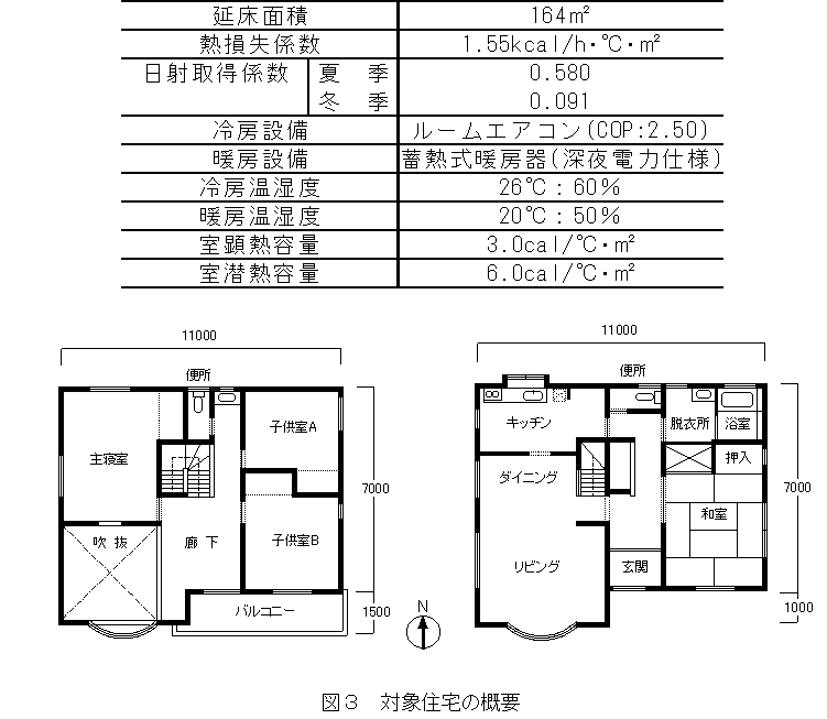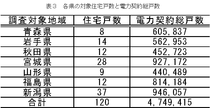 現在、東北地方に実際存在する東北7県の住宅において表に示す調査の協力の得られた120戸を対象として電力消費量の計測を行った。計測期間は1994年4月から1995年3月までの各住戸における電力消費量の計測を行った。(表3)