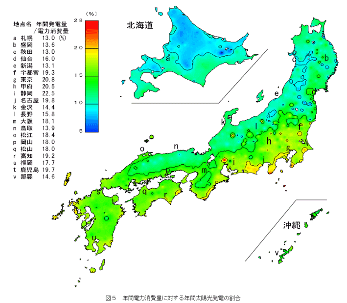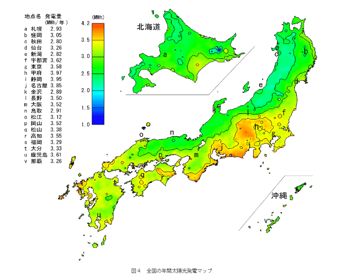 関東から南側の平野部では3〜4MWh/年程度の発電量となり、発電量の最も大きい地域は甲府、静岡で約4MWh/年である。