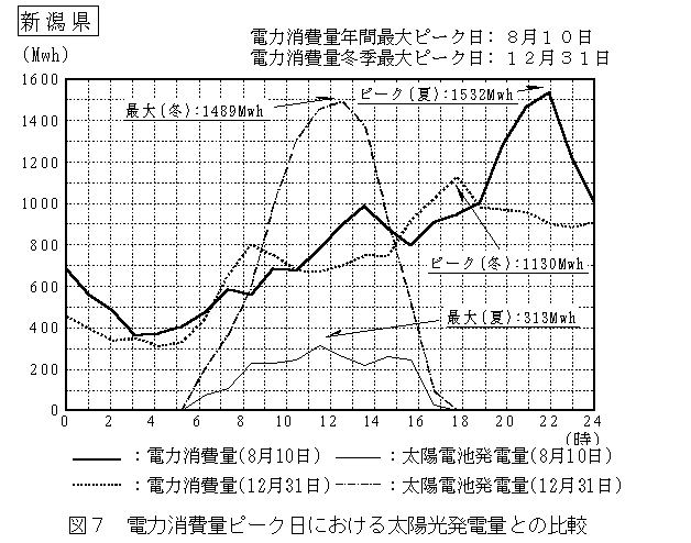 新潟県では電力消費量が年間最大ピークとなる8月10日は天候が悪いため、太陽光発電量による電力消費量の削減効果は低い。しかし、冬季のピーク日は天候に恵まれ、太陽光発電量は多く、午前8時頃から午後3時頃にかけてかなりの余剰電力を生じている。