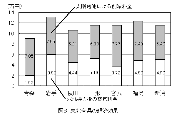東北各県の1住戸あたりの経済効果は各県とも太陽光発電システム導入後は導入前に比べ、55〜85%程度の電気料金を削減することができる。(図8)