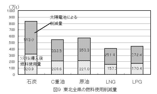 東北全県の燃料使用削減量は太陽光発電システム導入により、それぞれ60%程度の削減が可能である。(図9)