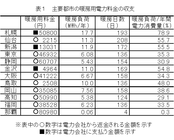 北海道、東北地方の日本海側及び山沿いの暖房負荷の大きい地域では、太陽光による発電電力で暖房用電力料金のすべてを賄うことは不可能であるが、その他の地域では太陽光発電のみで暖房負荷を賄うことができる。(表1)