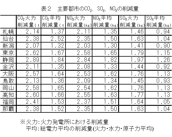 CO2、SOX、NOXの排出削減量は太陽光発電量に比例しており、発電量の大きな地点では削減量も大きくなる。各都市で大幅な削減が可能であり、環境への効果は大きい。(表2)